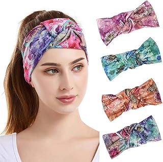 Sethexy Breit Boho Stirnbänder Kreuz und quer Verknotet Haarband 4 Stück Elastisch Blume Kopfbedeckung Wicking Kopftuch Yoga Kopfwickel Laufen Stirnband für Frauen und Mädchen